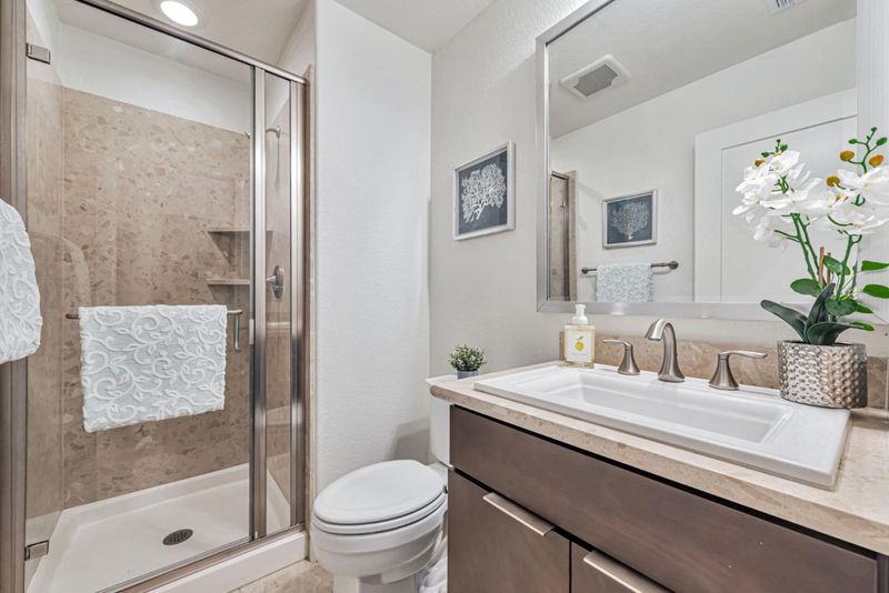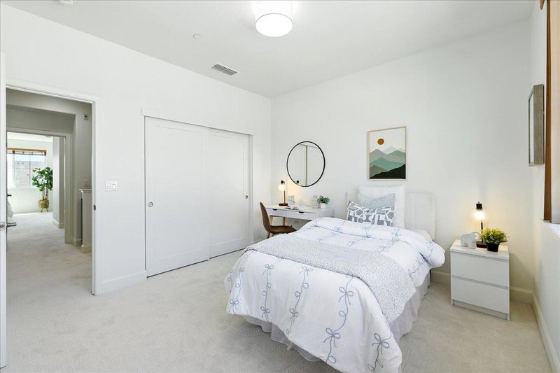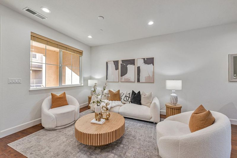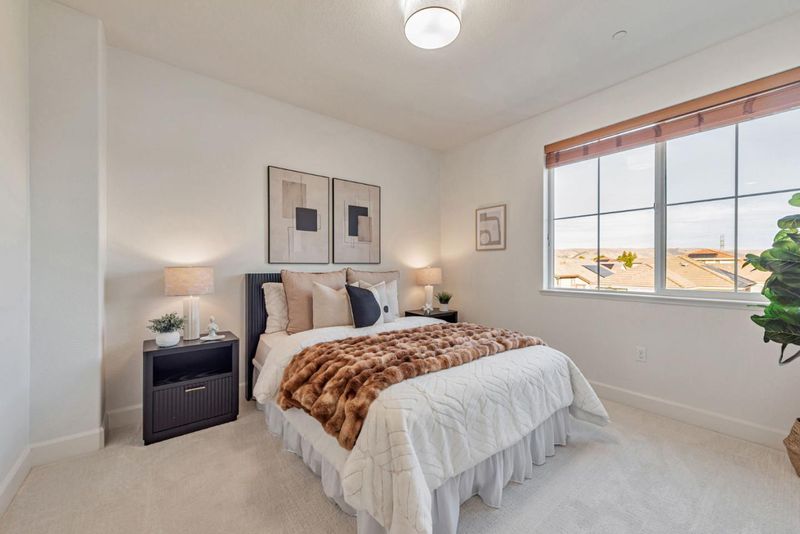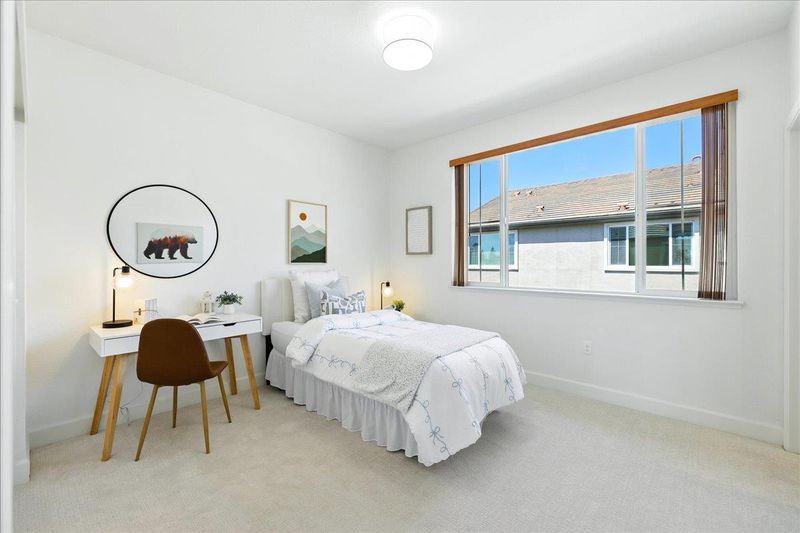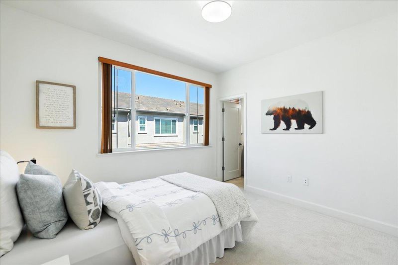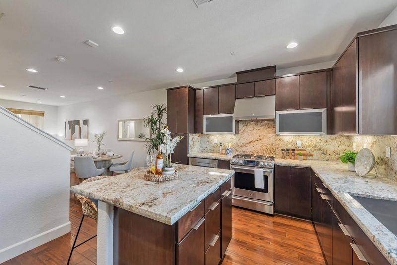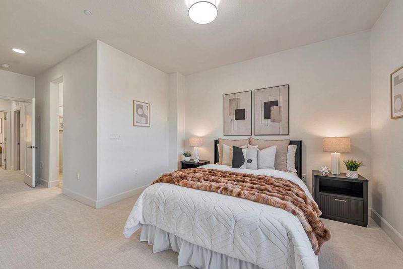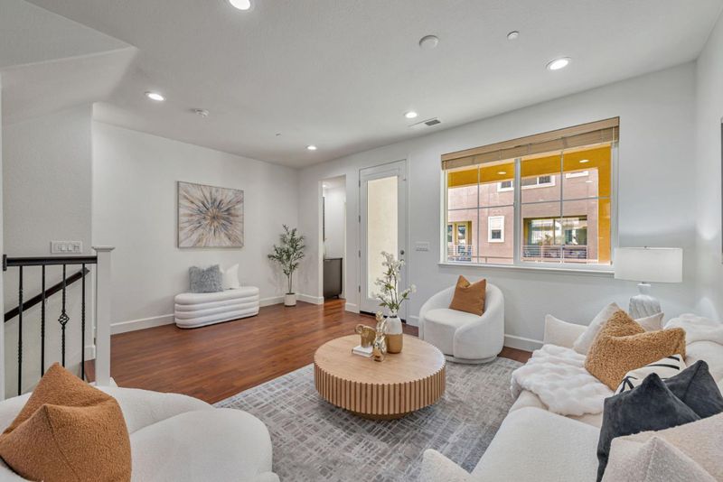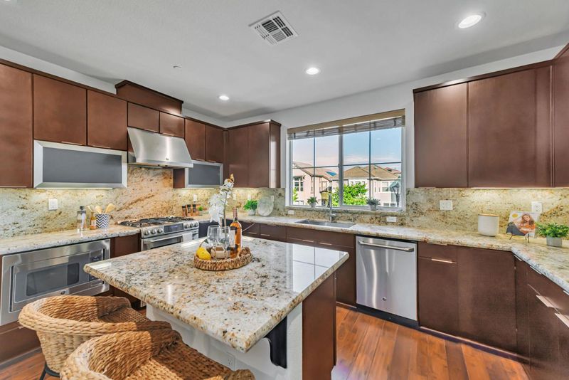 Welcome to this east-facing townhome featuring a charming front yard landscaped with fragrant lavenders and a rare private driveway offering two additional parking spaces. Step inside to discover a bright and open floor plan with abundant natural light. The ground-level bedroom includes a full bathroom and direct access to the two-car attached garage providing both comfort and convenience. The chefs kitchen is equipped with stainless steel appliances, a large central island, cherry cabinetry, and elegant stone countertops. Adjacent dining and living areas flow seamlessly onto an expansive balcony, perfect for enjoying your morning coffee. New carpet has been installed throughout the bedrooms, with wood floors in the main living areas. All rooms are fitted with window treatments for privacy and comfort. Upstairs, a luxurious master suite with a walk-in closet, oversized shower, and dual sink vanity. Two additional bedrooms have their own bathrooms, providing both comfort and privacy.+- Residents enjoy access to the exclusive 12,000 SqFt Avenue One clubhouse, featuring a pool, gym, yoga room, spa, and a spacious event room with gourmet kitchen. Prime location-walking distance to Costco, restaurants, community garden, and minutes drive to major freeways.