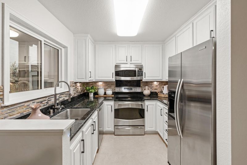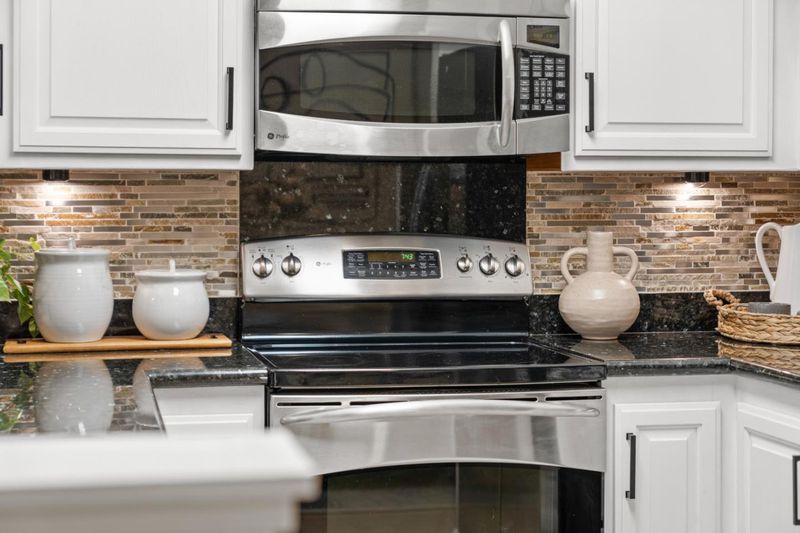 - 220 Volt Outlet, Cooktop - Electric, Countertop - Granite, Dishwasher, Garbage Disposal, Microwave, Oven Range, Oven Range - Electric, Refrigerator