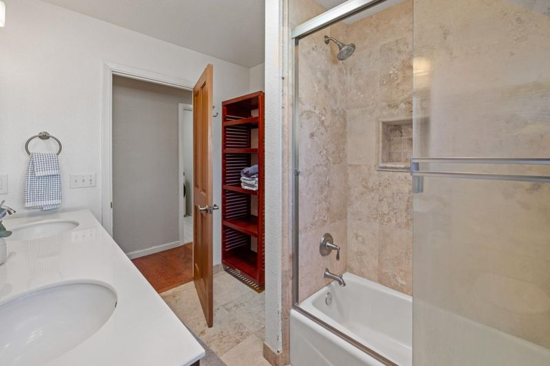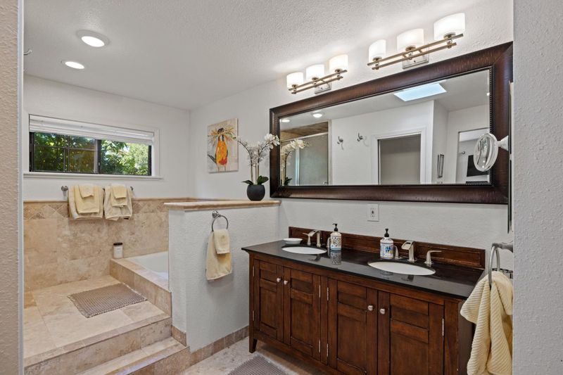 - Double Sinks, Primary - Oversized Tub, Primary - Stall Shower(s), Primary - Sunken Tub, Shower over Tub - 1, Skylight, Stone, Tub in Primary Bedroom, Updated Bath