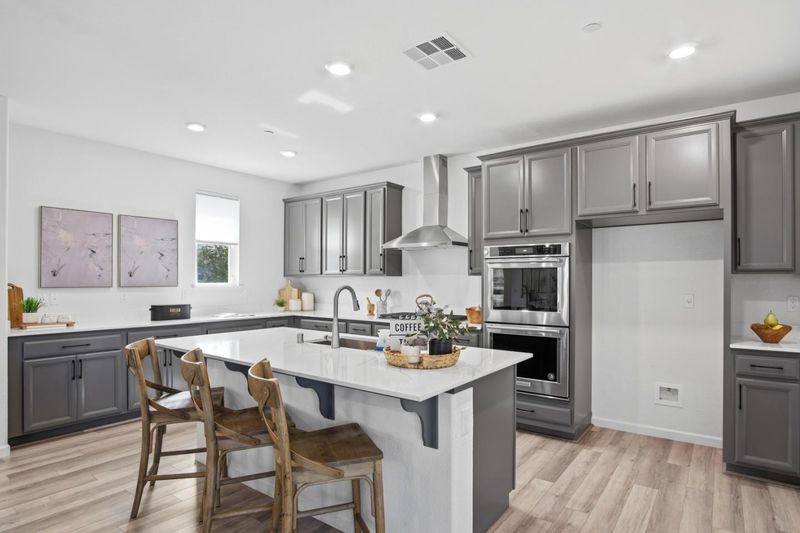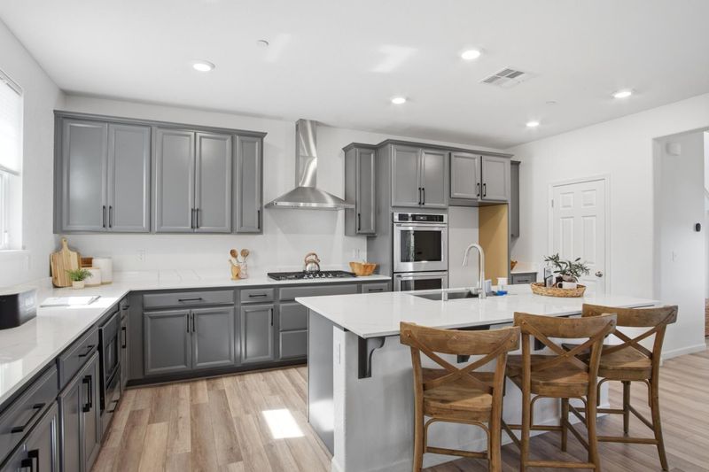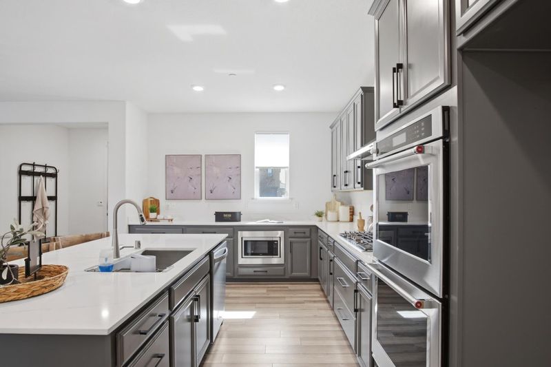 - Cooktop - Gas, Countertop - Quartz, Dishwasher, Exhaust Fan, Island with Sink, Microwave, Oven - Double, Pantry