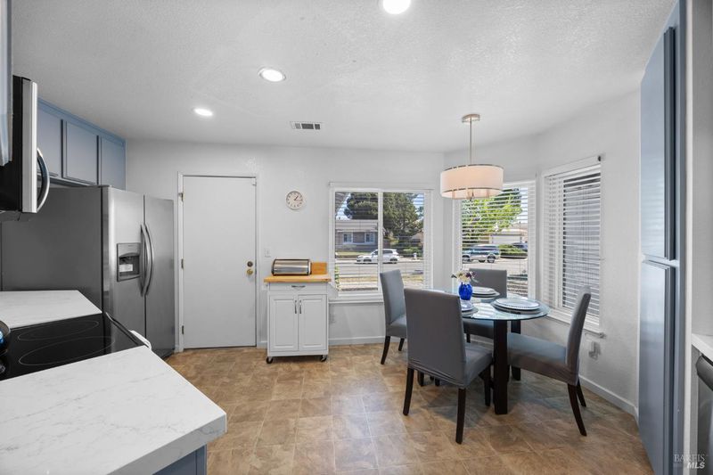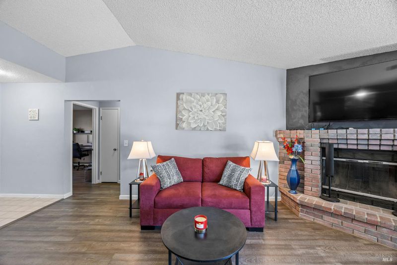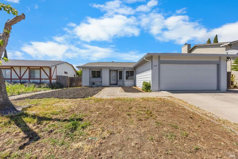 Step inside this beautifully updated 3-bedroom, 2-bathroom single-story home offering 1,327 sq ft of thoughtfully designed living space on a generous 6,098 sq ft lot. From the moment you walk through the door, vaulted ceilings and an open-concept layout create an inviting atmosphere that's perfect for everyday living and effortless entertaining. The heart of this home is a stunning kitchen featuring soft blue cabinetry, quartz countertops, a coordinating glass tile backsplash, stainless steel appliances, and a pass-through bar overlooking the spacious living room. A charming eat-in dining nook with abundant natural light makes morning coffee feel like a retreat. The generous living room showcases a classic brick fireplace, modern ceiling fan, and sliding glass doors that open to the backyard seamlessly connecting indoor and outdoor spaces. The primary suite offers room to relax with a ceiling fan and an ensuite bath featuring dual vanities and a glass-enclosed shower. Outside, a spacious backyard with mature trees and a concrete patio provides the perfect canvas for your dream outdoor oasis whether that's a garden, play area, or future ADU (buyer to verify with the city). A detached storage structure adds convenient functionality, and the wide driveway with attached 2-car garage provides ample parking. Recent updates include a newer roof and central heating and cooling giving you peace of mind from day one. Located in a quiet, established neighborhood with easy access to Suisun City's waterfront, dining, parks, and commuter routes, this home checks every box. Your next chapter starts here.
