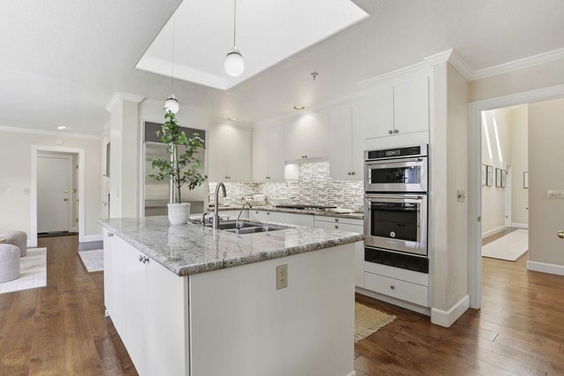 - 220 Volt Outlet, Cooktop - Gas, Countertop - Granite, Dishwasher, Exhaust Fan, Garbage Disposal, Island with Sink, Microwave, Oven - Built-In, Oven - Electric, Oven Range - Electric, Pantry, Refrigerator, Skylight, Wine Refrigerator