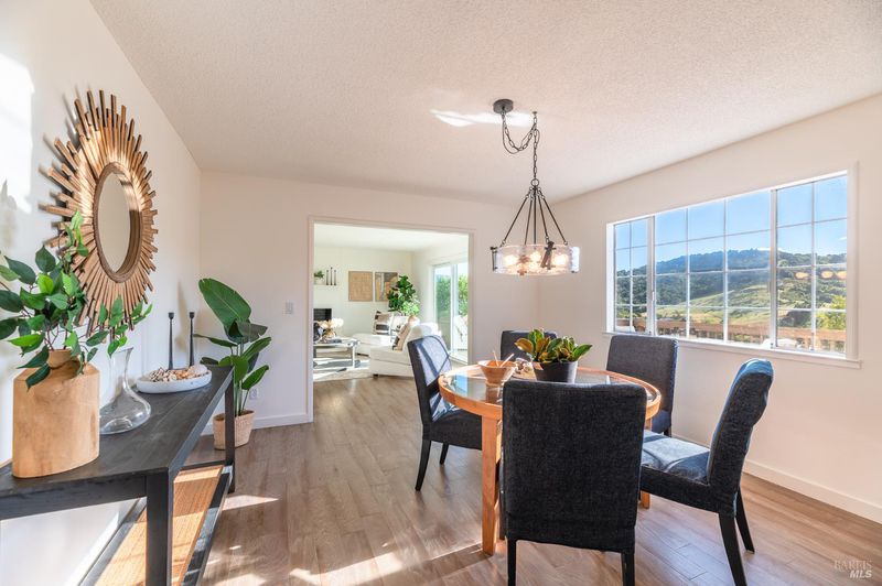 Situated on a cul de sac next to miles of open space, this remodeled home offers a perfect blend of comfort and style and ideal indoor-outdoor living. Boasting sweeping views that stretch across the valley to green hillsides, this property is a tranquil retreat ideal for those who appreciate both natural beauty and sophisticated living. The gorgeous modern kitchen includes sleek custom cabinetry, a massive center island, high-end stainless steel appliances, and elegant quartz countertops. Off the kitchen is a breakfast area with french doors opening to the backyard. Adjacent to the kitchen is a cozy family room with lovely built in shelving and a bay window. The light filled living room, with wood burning fireplace, opens to the expansive back deck. The formal dining room with a contemporary chandelier provides the perfect setting for hosting parties or family dinners. Upstairs are all 4 bedrooms, each with views. and 3 full baths. The primary suite has a bay window with a built-in bench seat, and an attached office that is the size of a bedroom. The primary walk-in closet is spacious with a central dressing island and a sun-splashed skylight. All the upstairs bathrooms are spa like with gorgeous custom cabinetry, beautiful shower stone walls and glass enclosures, and classic tile floors (2 of 3 heated). Throughout the home you will find custom details like slate-blue family room built-ins, plantation shutters and wide plank floors, creating an elevated feel. Air conditioning, updated electrical box and EV charger are welcomed additionals as well. The backyard is an outdoor oasis of level land, garden paths and elevated vistas. It is beautifully landscaped with vibrant flowers, fruit trees and hummingbirds. It is a bird watchers and gardeners paradise. Evenings are spent dining under the pergola, or relaxing on the extensive deck and enjoying magical sunsets over the Western hills Step out the front door and onto miles of pristine hiking and biking trails, offering instant access to Marin's trailheads and pristine nature. While you feel worlds away, you remain just minutes from local shopping, dining, and easy commute routes to SF, East Bay and all Marin has to offer. Located within the top-rated Dixie school district. Experience the rare combination of remodeled elegance, scenic serenity, and unrivaled outdoor access. This is more than just a home; live the Marin lifestyle.
