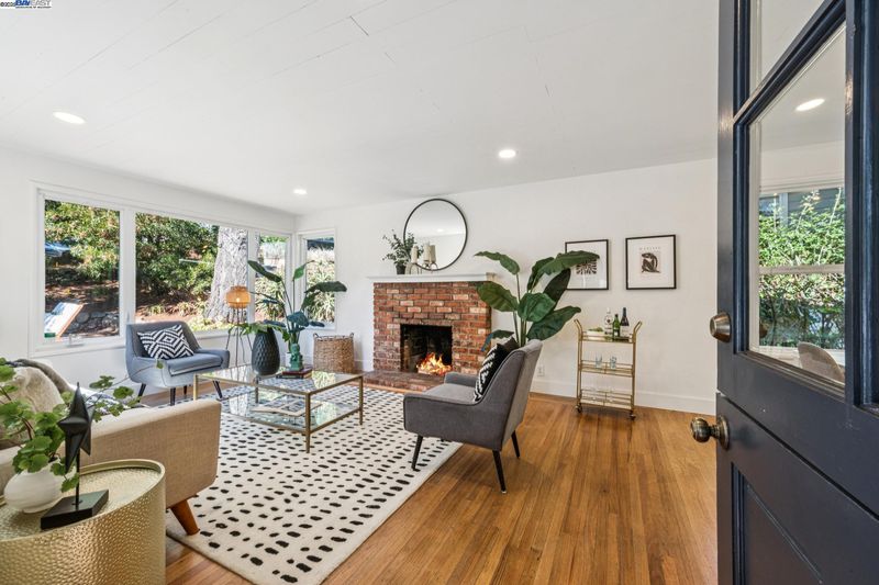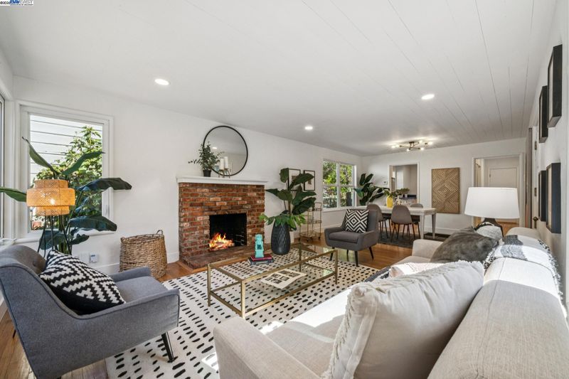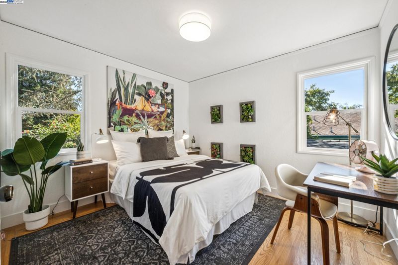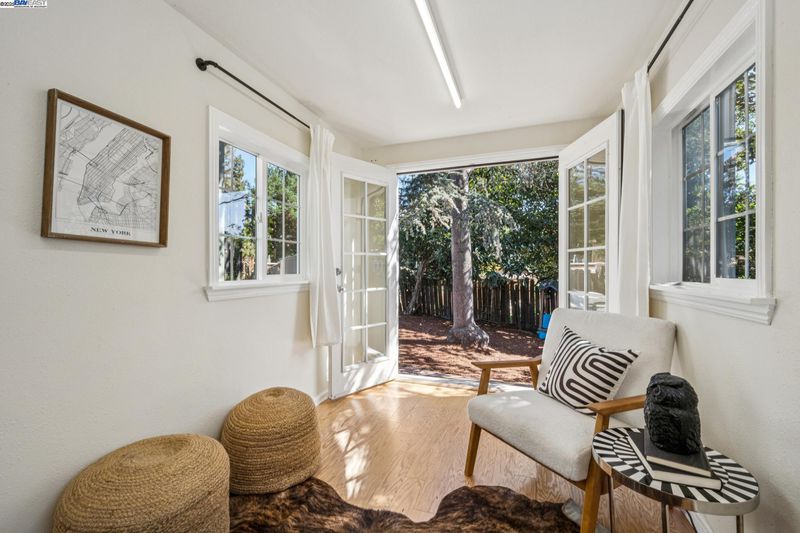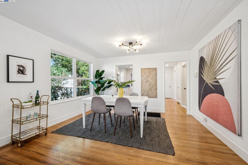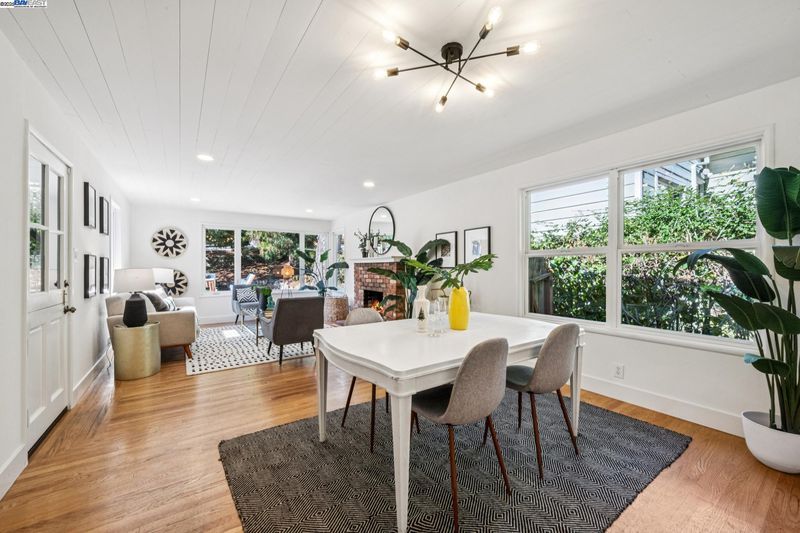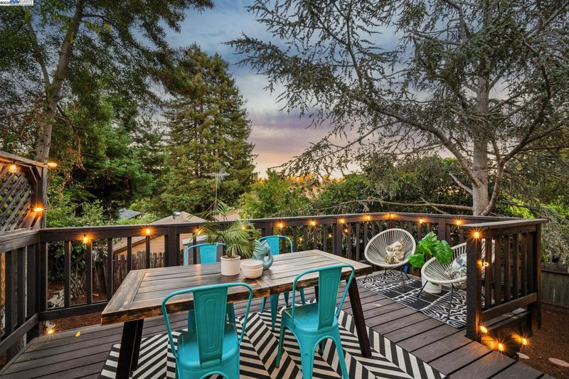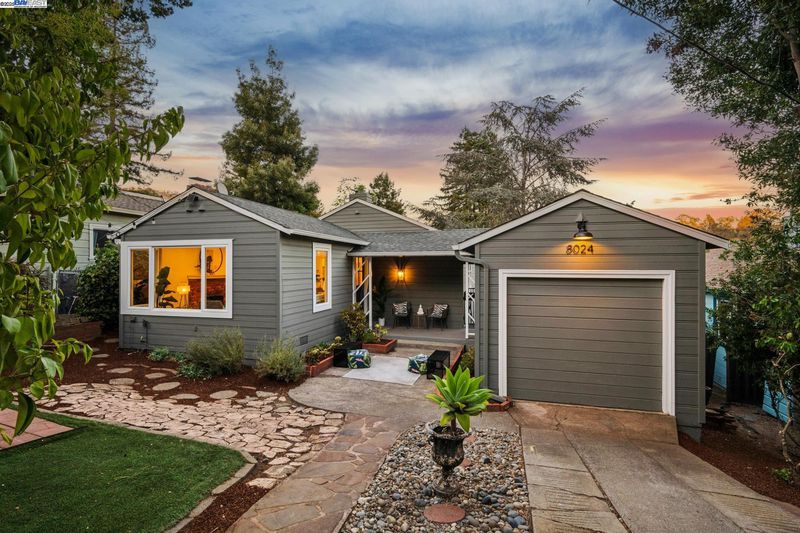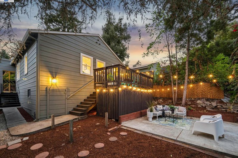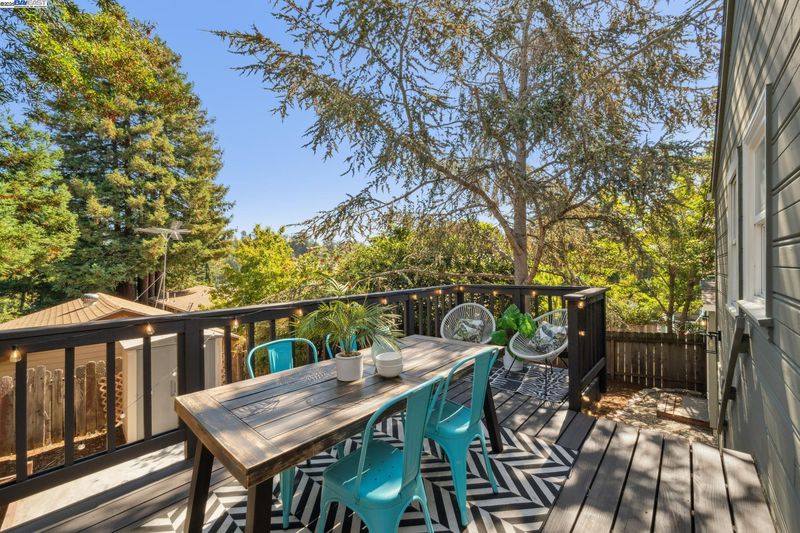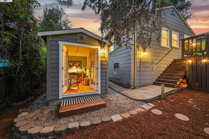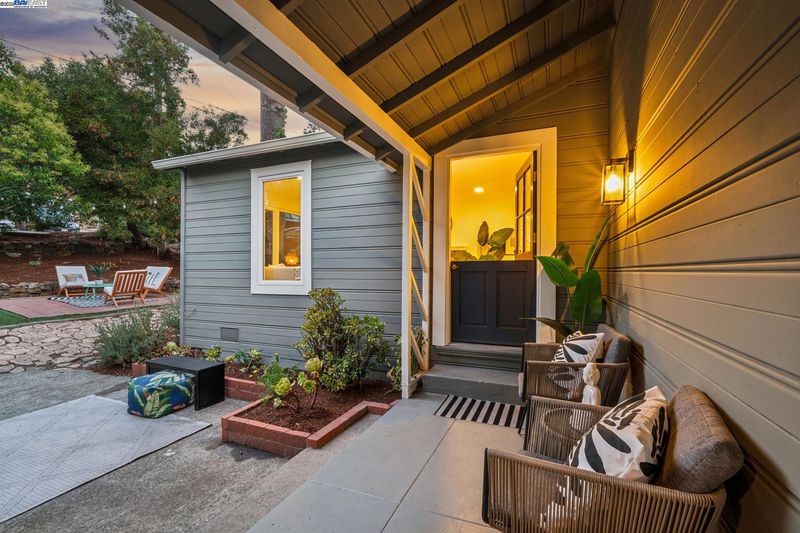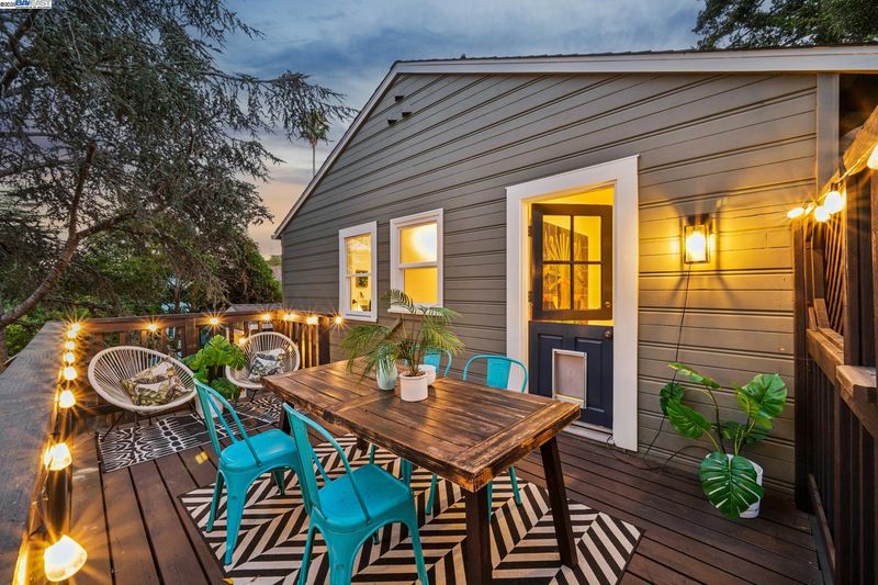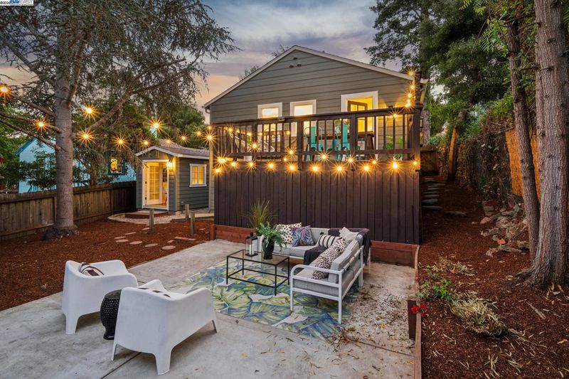 Enjoy the beautiful East Bay hills as a backdrop to your life in this stylishly upgraded 2+BD/1BA bungalow with two separate casitas steps from the King Estate Open Space. Privately surrounded by mature trees, the 1310 SQFT home welcomes you with a charming Dutch door and front yard seating area. Step into the sunny living room where you can relax with a fireplace and garden view. A clapboard ceiling and beautiful hardwood floors span into the dining room, and the upgraded eat-in kitchen features new appliances and recessed lighting. Through a convenient laundry area, there’s another Dutch door onto a deck for wonderful indoor/outdoor living. Dine al fresco overlooking the spacious backyard, entertain friends on the large front patio, or play in the garden. A recently built casita is perfect as an office or workshop, while the freestanding converted garage makes for another great space to work or unwind. Back inside two sunny bedrooms share a full bath. One bedroom includes a cedar-lined closet and clapboard walls, while one is slightly larger with backyard views. Parking is easy with a parking pad and long driveway. Out the front door, take your dog to the open space park down the street and admire the panoramic views, or visit the zoo and the multiple regional parks nearby.