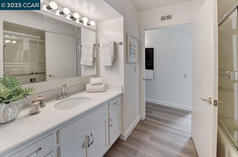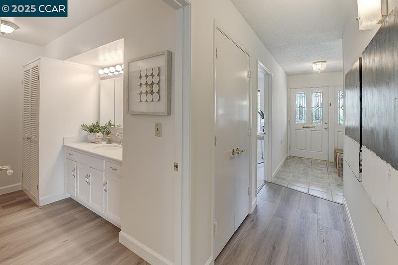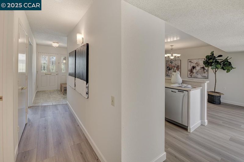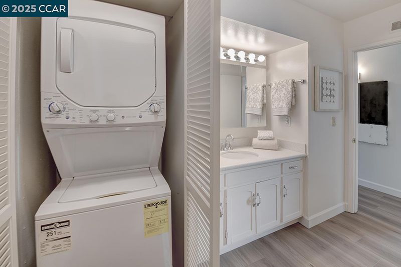 Darling, end unit San Franciscan model, tucked away in a quiet setting. This is a highly desirable model that is level-in with nobody above or below. Enjoy the peaceful outdoors from the privacy of the fenced in front patio or the interior atrium. All new vinyl plank flooring and fresh interior paint. Stacked washer/dryer in bathroom. There is a serene wooded setting directly to the side of this property. An owner could apply for a Rossmoor permit to replace the wood fencing to a wrought iron fence to take advantage of the view from the patio. Carport is close by with an lots of extra built in storage. This home is move in ready with tons of potential!