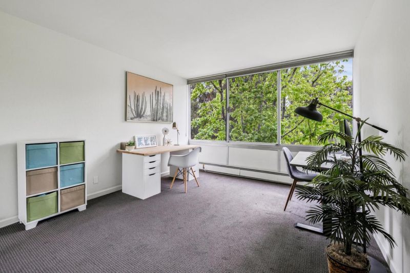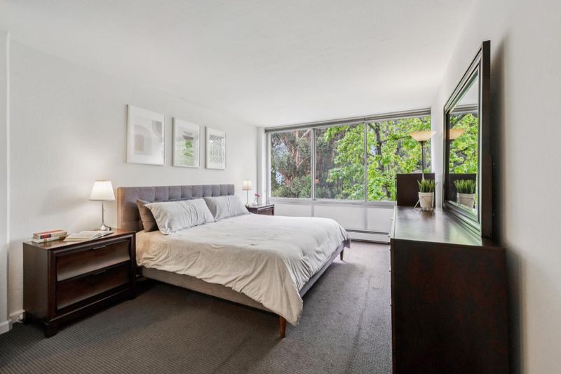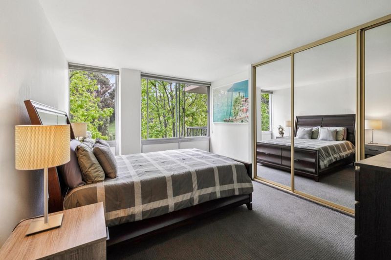 Wake up surrounded by light, space, and privacy. This spacious condo blends clean design with everyday ease, featuring floor-to-ceiling, wall-to-wall windows in the living room that frame peaceful treetop views and open to an expansive deck that extends the living experience outdoors. The updated kitchen showcases quartz countertops, a custom tile backsplash, under cabinet lighting, and stainless-steel appliances. The remodeled bathrooms offer a fresh, refined look with quartz countertops, custom tile surrounds at the tub and showers, and newly tiled floors. Laminate plank flooring carries throughout the home, adding warmth and continuity to the living spaces. Closet organizing systems add thoughtful function throughout. The result is a home that feels open, calm, and beautifully livable. Secured entry, 2 covered parking spaces, an additional storage space, and resort-style amenities including 2 pools, 2 spas, a fitness center, billiards room, and a community room with bay views elevate daily life. This is the kind of home that makes coming back the best part of the day. Come experience the light, scale, and serenity for yourself.