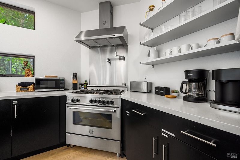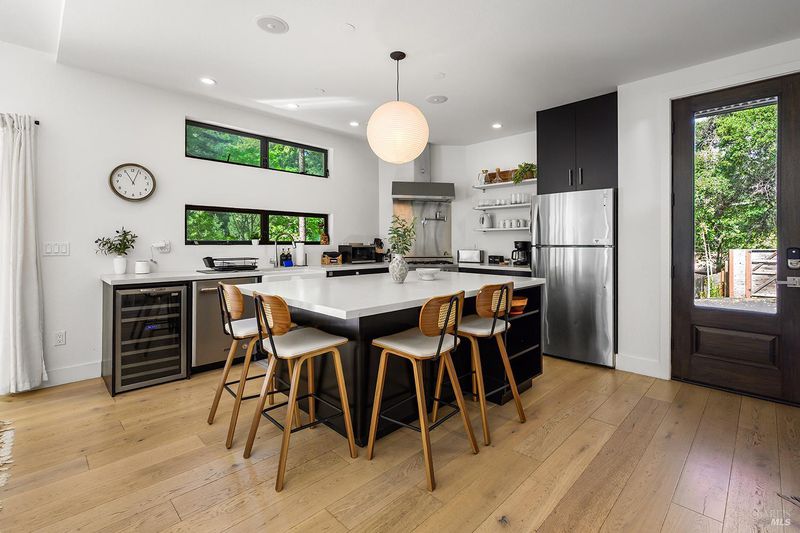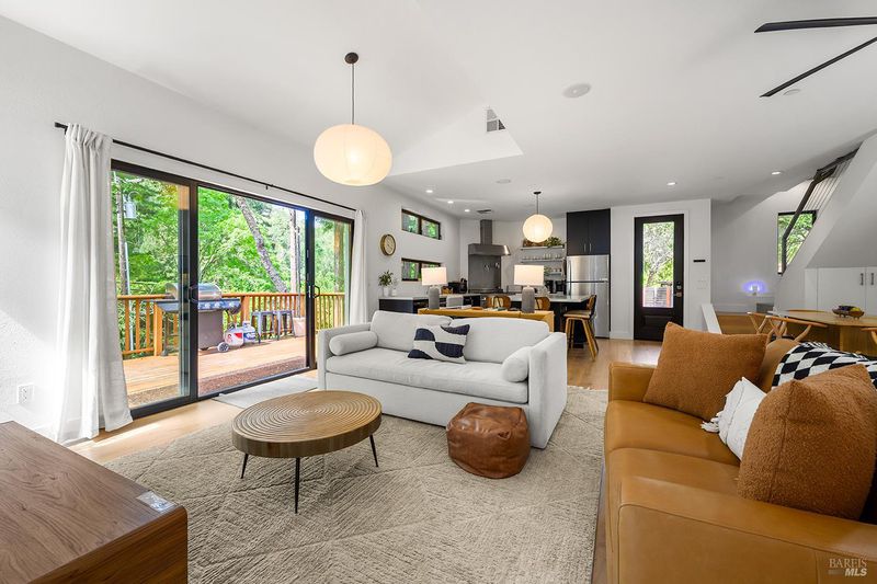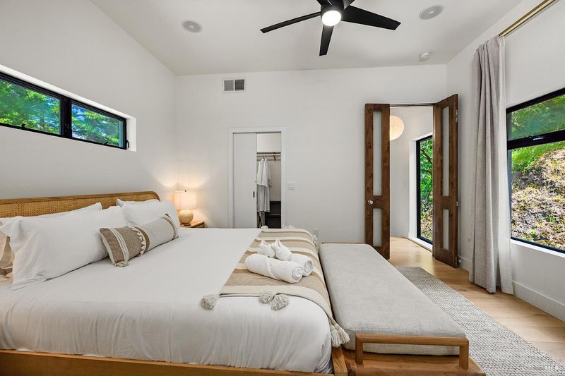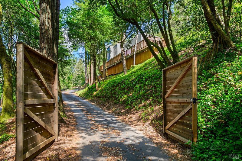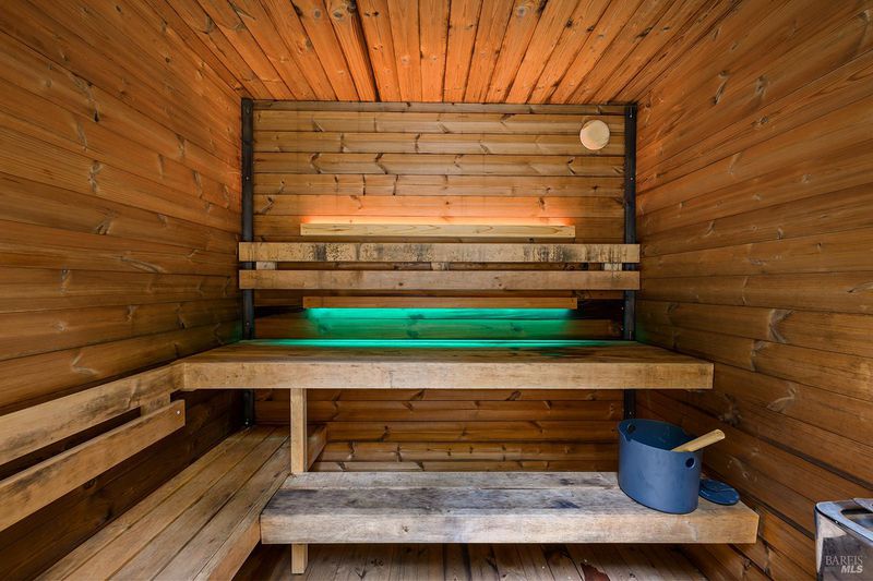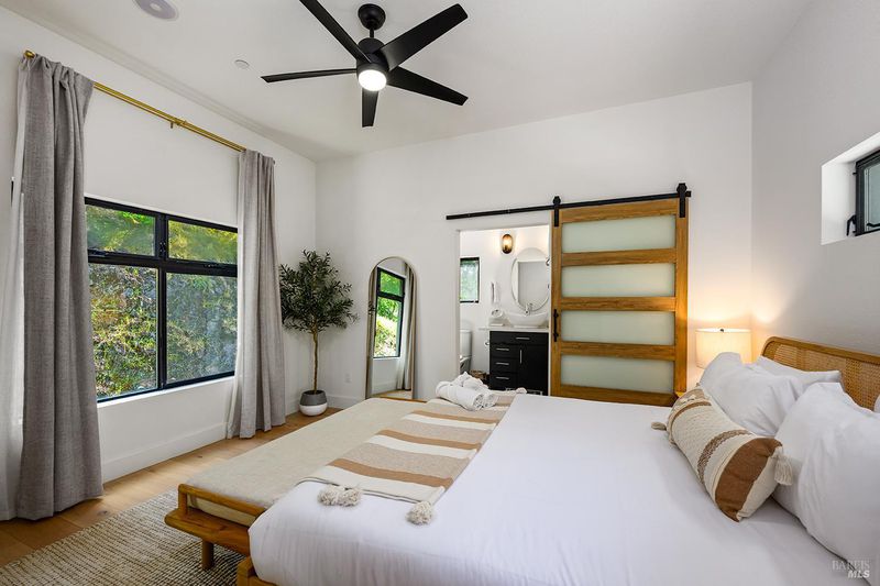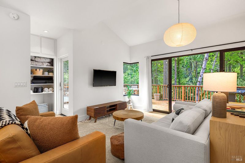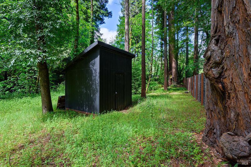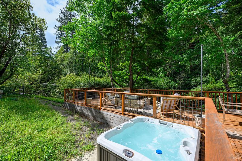 Eight minutes from the Healdsburg plaza, Mill Creek Road gives way to a forest canopy and the kind of quiet that makes you exhale. That's the setting for 2563 & 2560 Mill Creek Rd combined to offer an almost 1 acre property, modern designed 2 bedroom, 2.5 bathroom 1,409 sqft home, genuine nature immersion, and one of the most compelling income opportunities in Healdsburg today. A striking modern home with floor-to-ceiling windows, warm oak plank floors, and an open-concept layout built for living well. The kitchen anchors the main level with a large island, wine fridge, stainless appliances, and floating shelves. Multiple glass sliders dissolve the boundary between inside and out, opening to an expansive deck for dining and entertaining, gravel path, dedicated patio, hot tub, cold plunge, and sauna the kind of amenity stack that earns five-star reviews or creates quality memories. Both ensuite bedrooms sit upstairs, framed by forest views on every side. Cross Mill Creek Road to the south parcel: a fully fenced half-acre with Mill Creek frontage, mature trees, flat open terrain, and a large storage shed ideal for recreation or leisure. Must see to appreciate this unique offering.