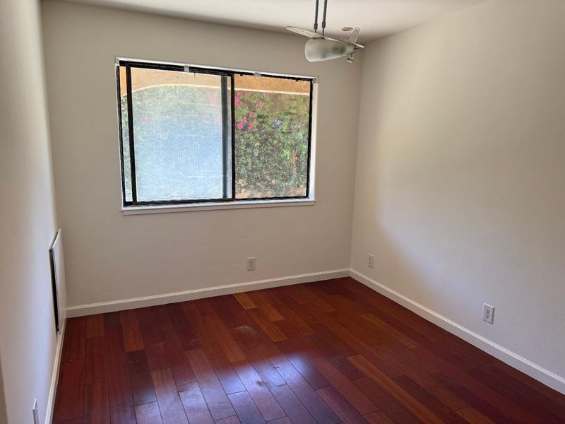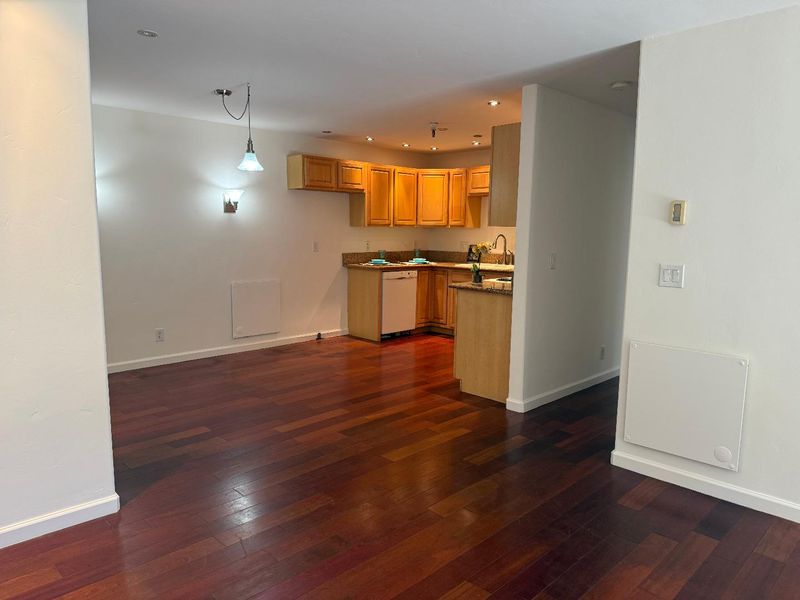 Updated spacious ground floor unit with private yard, wood floors, granite counter kitchen, recessed lighting, walk-in closet with laundry hookups, extra storage room in yard. Open kitchen/dining area, living room leading to sliding glass doors to private yard. 2 nice sized bedrooms with windows looking onto private yard. Security gated community with array of amenities including pool, spa, club house, BBQ area, green space. Great location - walk to shopping and restaurants.