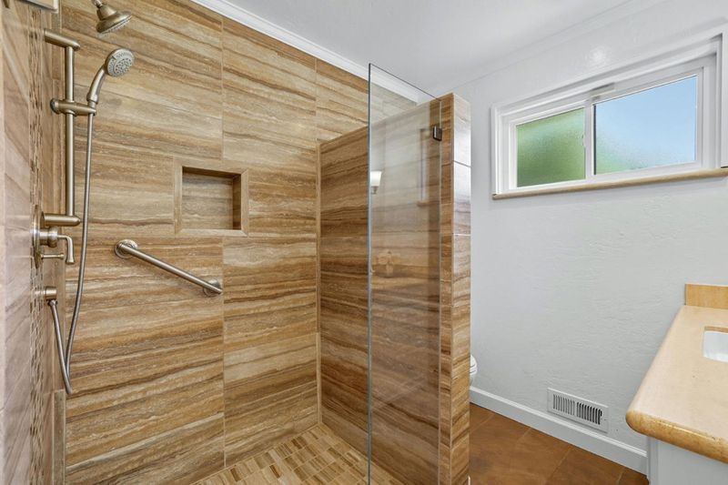 - Primary - Stall Shower(s), Shower and Tub, Stall Shower, Stone, Updated Bath