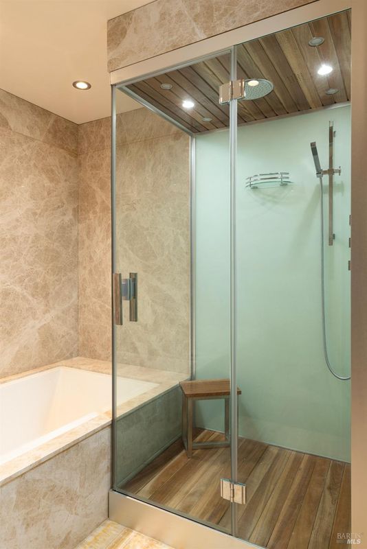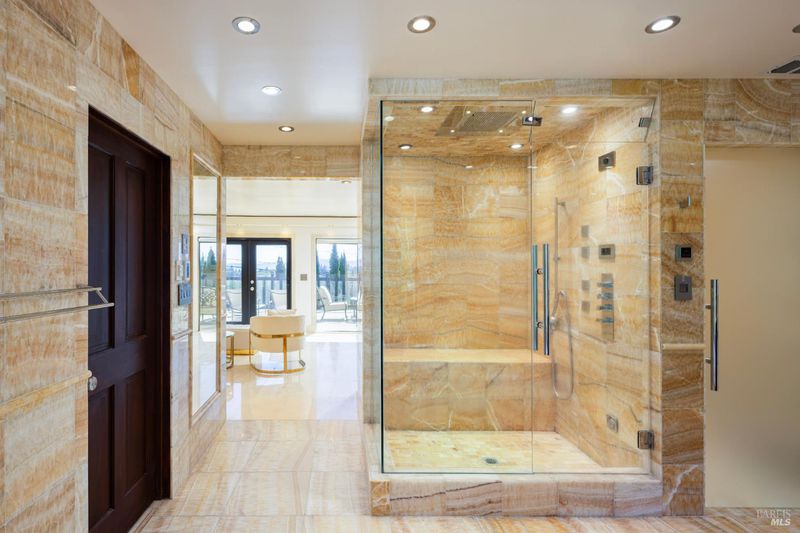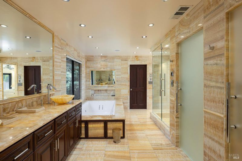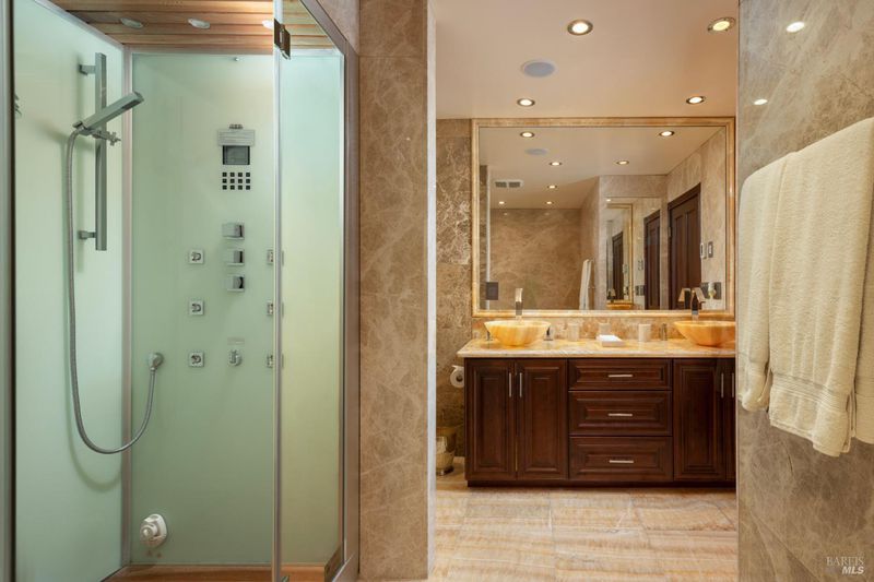 - Bidet, Double Sinks, Jetted Tub, Quartz, Radiant Heat, Shower Stall(s), Steam