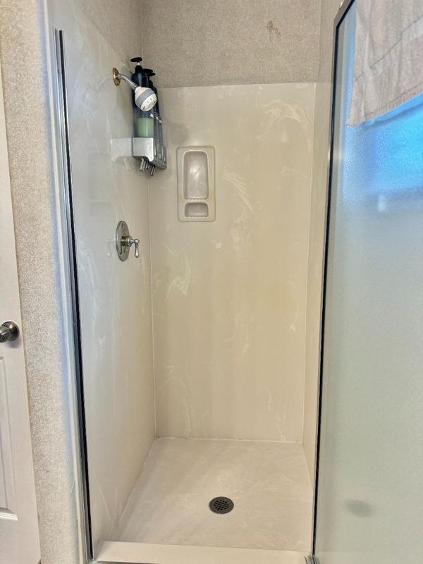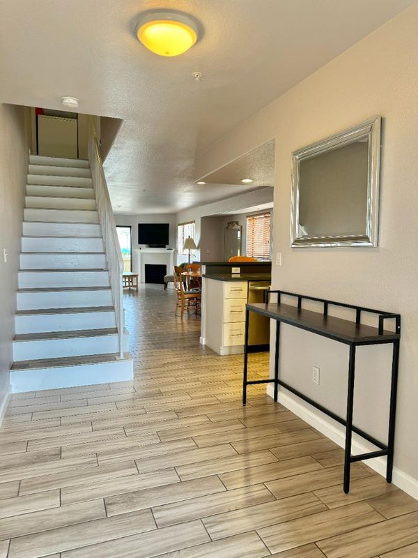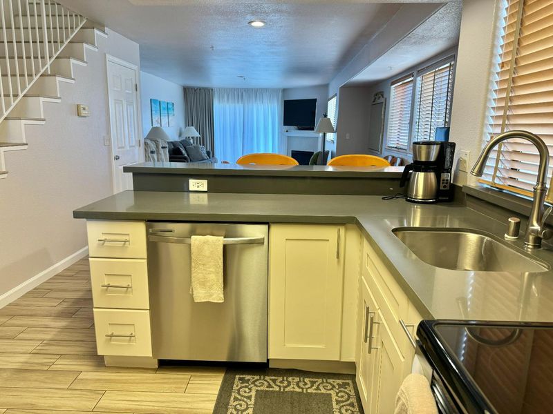 - 220 Volt Outlet, Countertop - Quartz, Dishwasher, Garbage Disposal, Microwave, Oven Range - Electric, Refrigerator