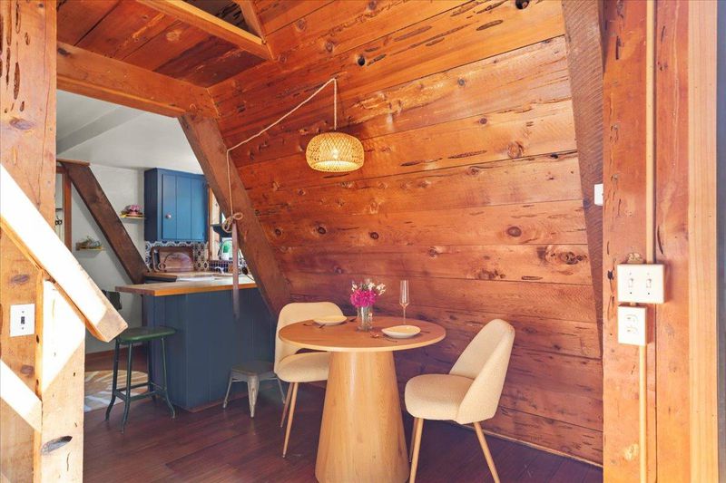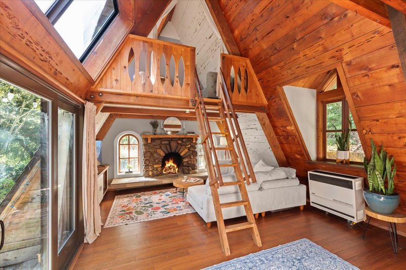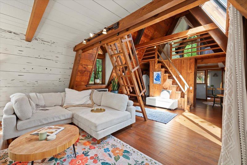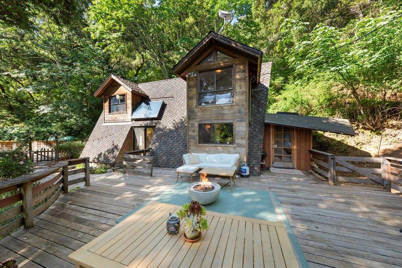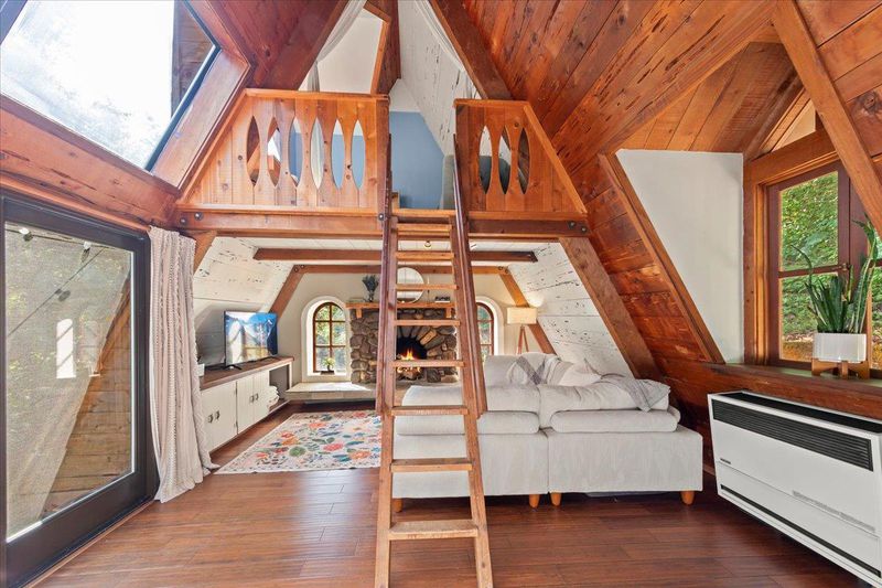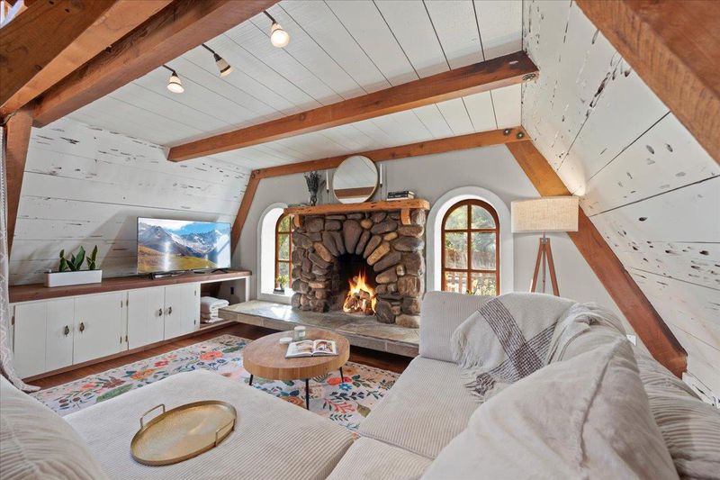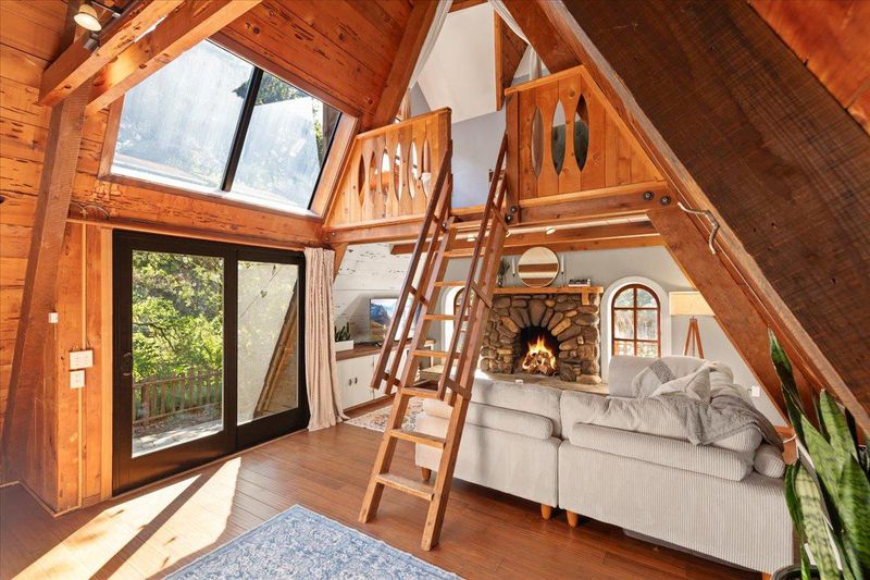 Tucked into 2.5 hillside acres next to Garland Park's Kahn Ranch, this 2-bedroom, 1-bath A-frame cottage blends rustic charm with modern comfort. A stone fireplace, pecky cedar, vaulted ceilings, and skylights enhance the open farmhouse kitchen, dining nook, and living area. Loft-style bedrooms and a separate laundry/mudroom add function. The bathroom has a walk-in tile shower, and a new water heater plus lifetime shingle roof provide peace of mind. Outside, enjoy an enchanting garden, well-lit driveway, and newly installed parking area. The expansive deck and private trail offer mountain views and easy access to nature. Minutes from a seasonal waterfall, creek, and the Village yet bordering open space this retreat is ideal for full-time living or a weekend escape.