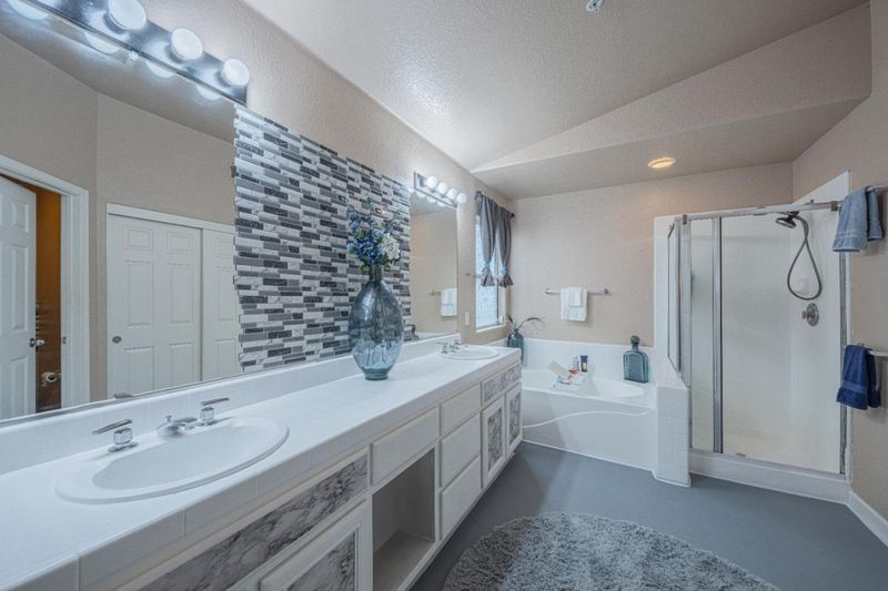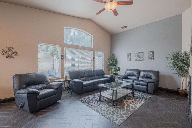 This beautiful 2384 sq ft home features four bedrooms and 2.5 baths, including a spacious ground-floor primary bedroom suite with a walk-in closet, sitting area, and a large bathroom. The kitchen is a chef's delight, equipped with granite countertops, a double oven, a gas range with a custom updraft exhaust, and a touchless faucet. Enjoy the flexibility of multiple dining options, including a breakfast bar, breakfast nook, and a formal dining area in the living room. The home boasts a separate family room with high ceilings and a fireplace, providing a cozy ambiance. The flooring combines carpet and tile, offering both comfort and durability. Other amenities include a utility room with a washer and dryer, a three-car garage, dual-pane windows, and more. The entertainers' back patio is equipped with everything you need for an enjoyable family gathering, allowing you to sip and savor while relaxing under the lights. This home seamlessly combines functionality and style, making it perfect for any family.