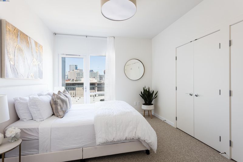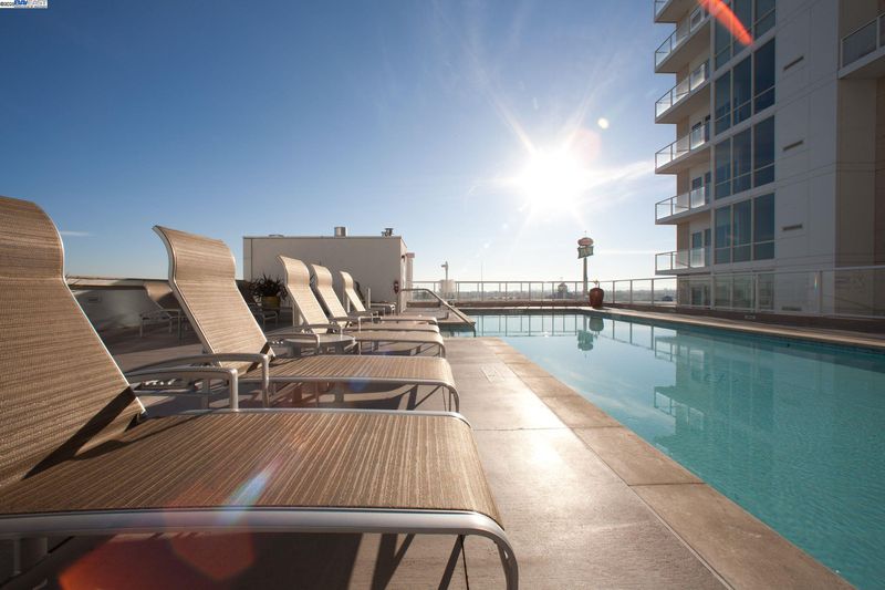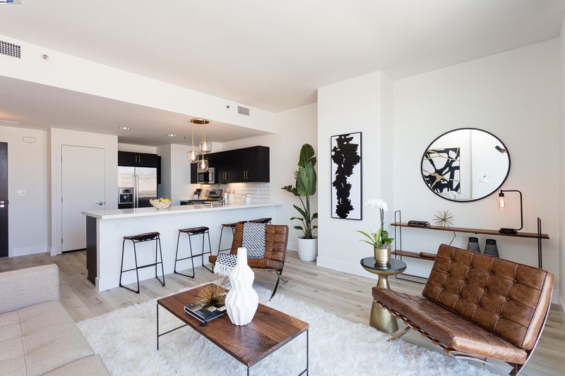 Sleek, modern, fully remodeled one-bedroom, one-bath, boasts a dynamic cityscape view and a perfect entertainment kitchen. Rich black cabinets and stunning quartz counters take center stage to the open living design. Floor to ceiling windows showcase the city lights. Designer lighting and hardware add a nice polish to a classic style. The beautiful light floors have a farmhouse rustic grain. They provide a lovely contrast to the smooth walls and dark cabinets. The bedroom offers double closets, dynamics views, and a terrific balcony. The bathroom is spacious and nicely appointed with a large soaking tub and a separate stall shower. Parking and storage are also included. The Ellington is minutes from BART, the Alameda/Oakland Ferry, and Amtrak. Walk to a plethora of fine restaurants, bars, breweries, theater, music, and art galleries. This modern full-service high-rise has 24/7 concierge, beautiful pool deck with heated pool, spa, showers, and BBQ. It also has an impressive fitness center, and a terrific community lounge, with full kitchen, tables, soft seating, and DirecTV™. This is luxury urban living at its finest.