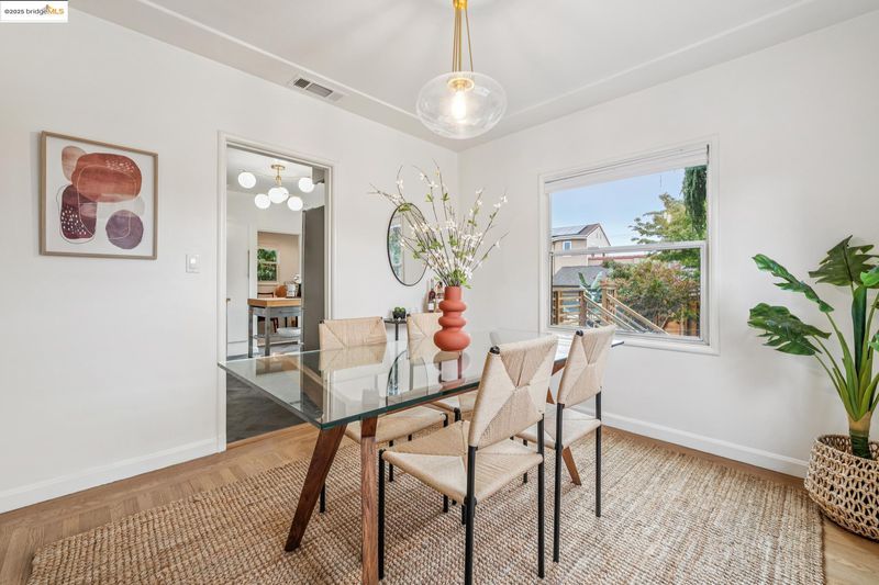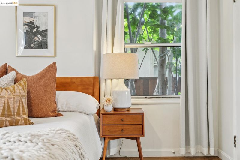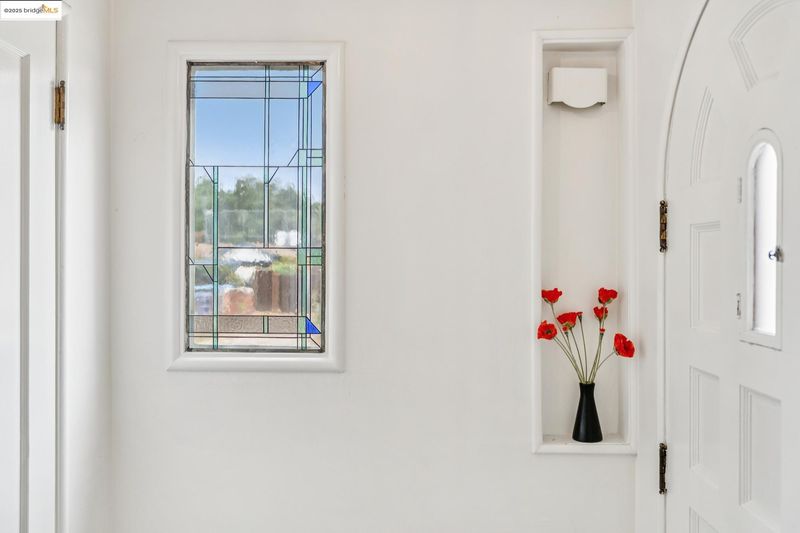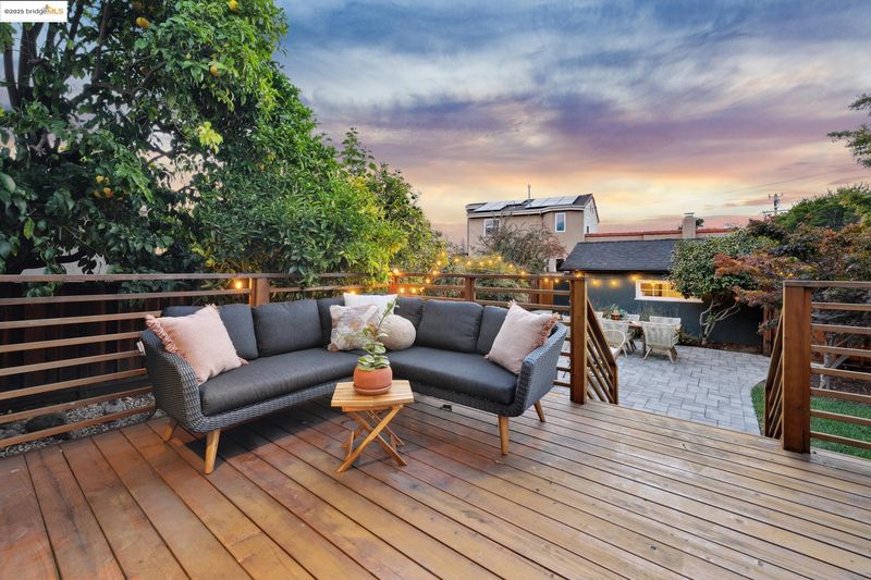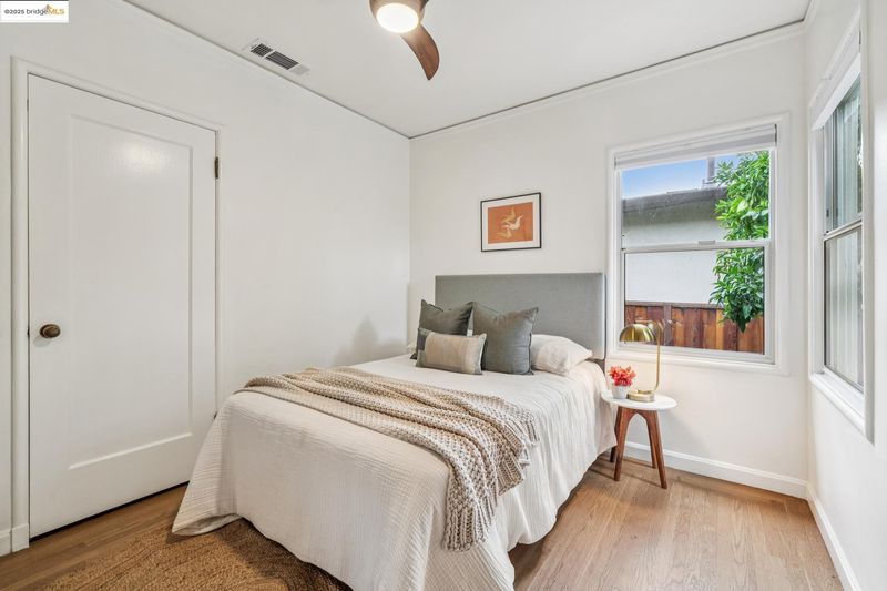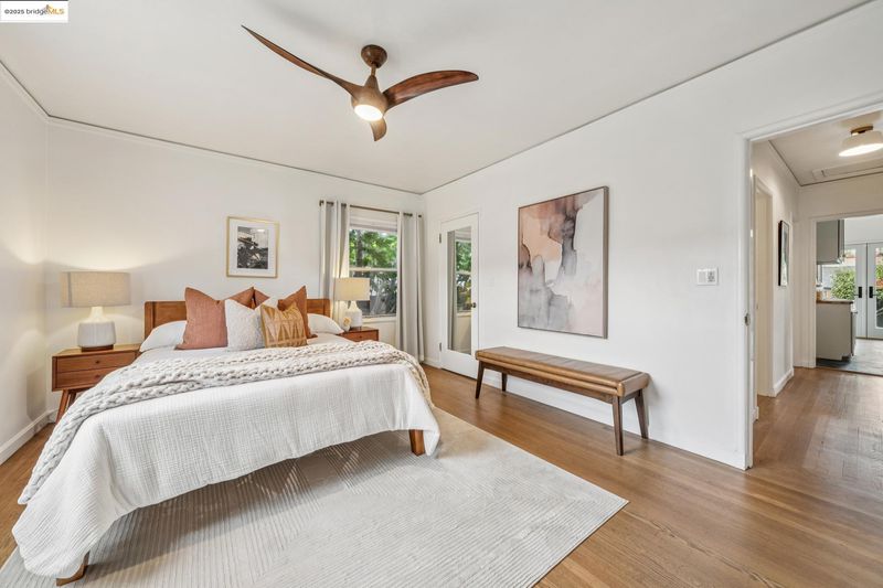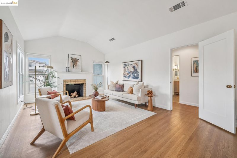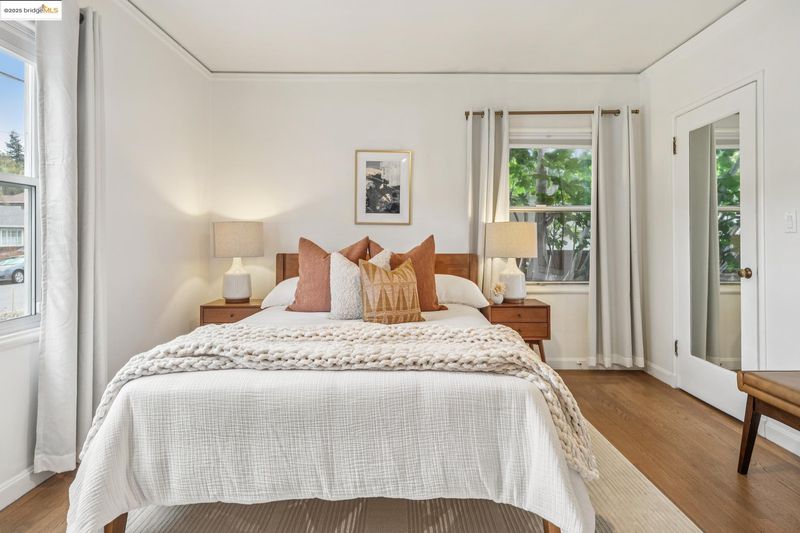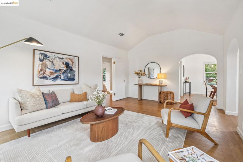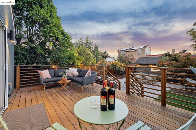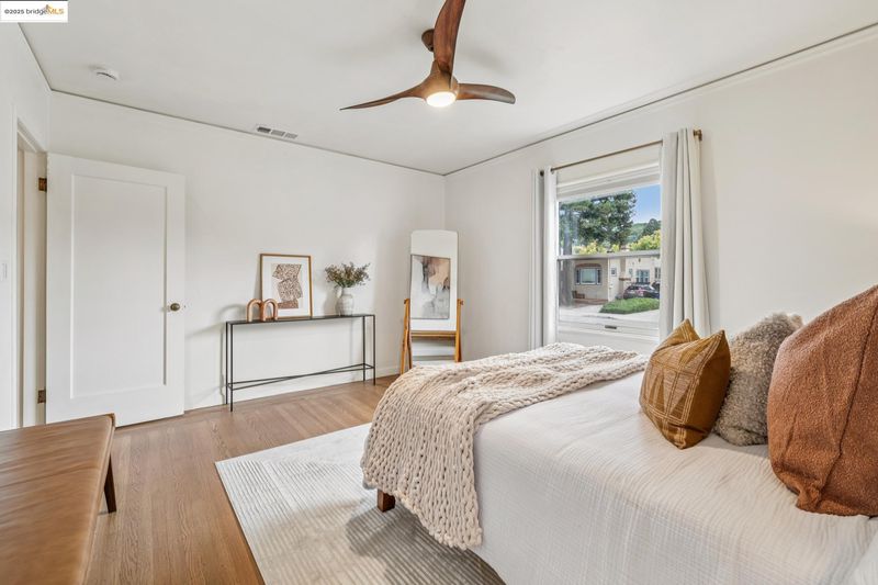 Sitting on a large corner lot in San Leandro’s beloved Broadmoor neighborhood, 999 Alice Ave is a 1938 bungalow that beautifully blends timeless charm with smart upgrades and incredible outdoor living. The striking exterior features a bold modern color palette, brick chimney accents, and an inviting arched front door. Inside, restored white oak floors and a soaring 10-foot barreled ceiling bring warmth and character, while updates like dual-pane windows, upgraded electrical, and a new HVAC system with central A/C make life easy. The remodeled kitchen offers radiant heated floors and French doors that open to a spacious redwood deck. The backyard is designed for entertaining with a grassy lawn, sleek paver patio, and mature grapefruit, orange, and fig trees, all framed by tall redwood fencing for added privacy. The detached garage provides a Tesla EV charger and the flexibility to convert into a workspace, while a side shed and newly built concrete pad allow for even more storage potential. The home is perfect as is, yet the expansive front yard offers opportunity for future fencing, expanded outdoor living, or even possible home expansion. With Koolfi Creamery, Top Hatters, 580, and BART all nearby, this home is move-in ready with room to grow.