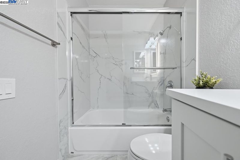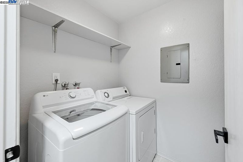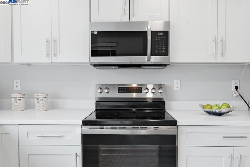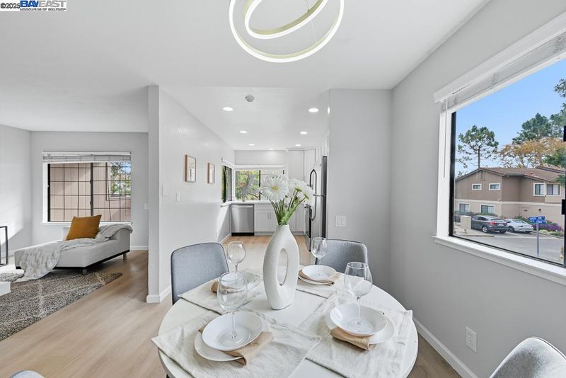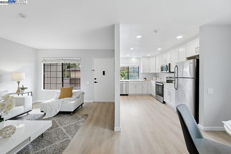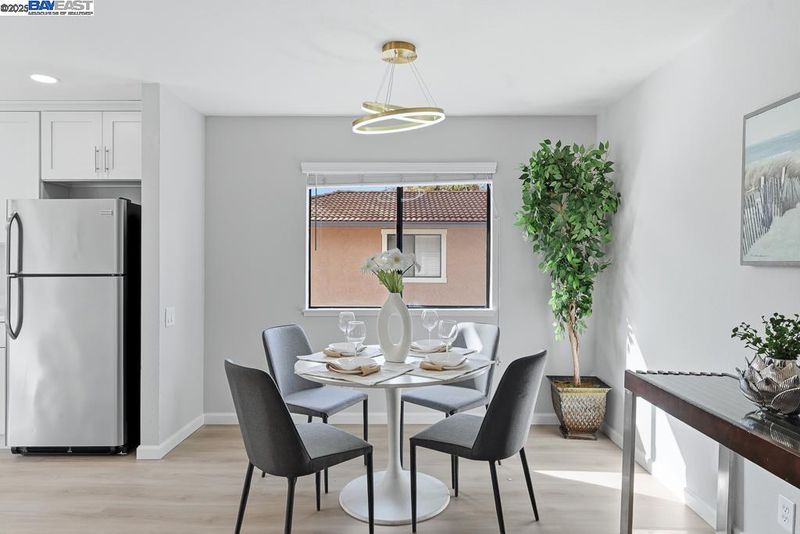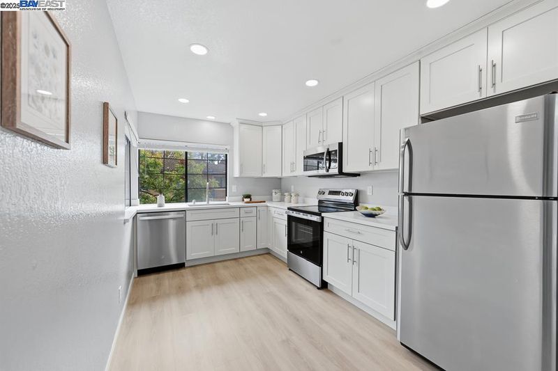 Bright and beautiful upstairs corner unit with 2 car garage below. This home features brand new low maintenance SPC vinyl flooring thruout. Enjoy a modern kitchen with new cabinets, quartz countertops, and new stainless steel appliances and recessed led ceiling lights. Convenient laundry room includes full size washer and dryer. Two spacious bedrooms. Primary bedroom has walk in closet. Updated bathroom with new vanity and quartz surround bathtub and shower door enclosure and elegant finishes. Move in ready and designed for comfortable, low maintenance living! Conveniently located near freeway access, BART, shopping, schools and parks.
